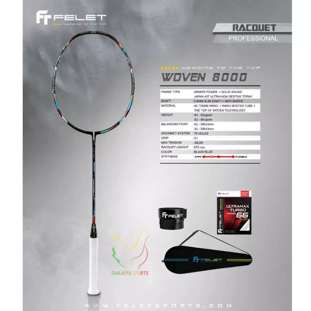 FELET RAKET BADMINTON FELET WOVEN TJ 1000 3U & 4U=HABIS ORIGINAL. BONUS: RAKET COVER PVC, OVER GRIP 750D, SENAR FELET ULTRAMAX TURBONANO 66 WHITE Harga :