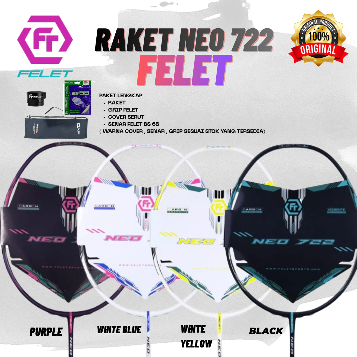 FELET RAKET BADMINTON BULUTANGKIS RAKET FELET NEO 722 ORIGINAL WARNA BLACK , WHITE BLUE , PURPLE , WHITE YELLOW Harga :