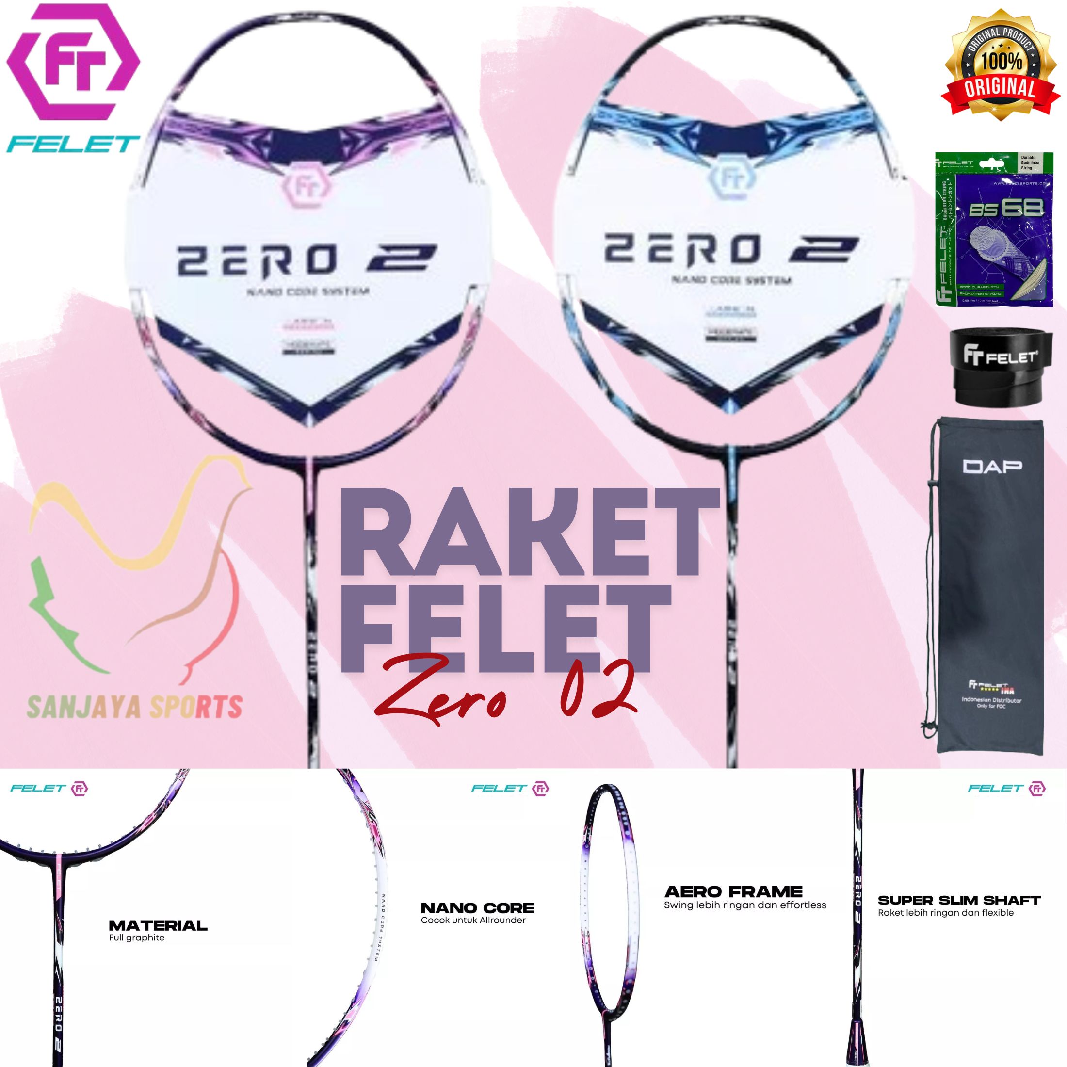 felet RAKET BADMINTON FELET ZERO 2 / ZERO 02 ORIGINAL Color : BLUE, PURPLE (4U) Harga :