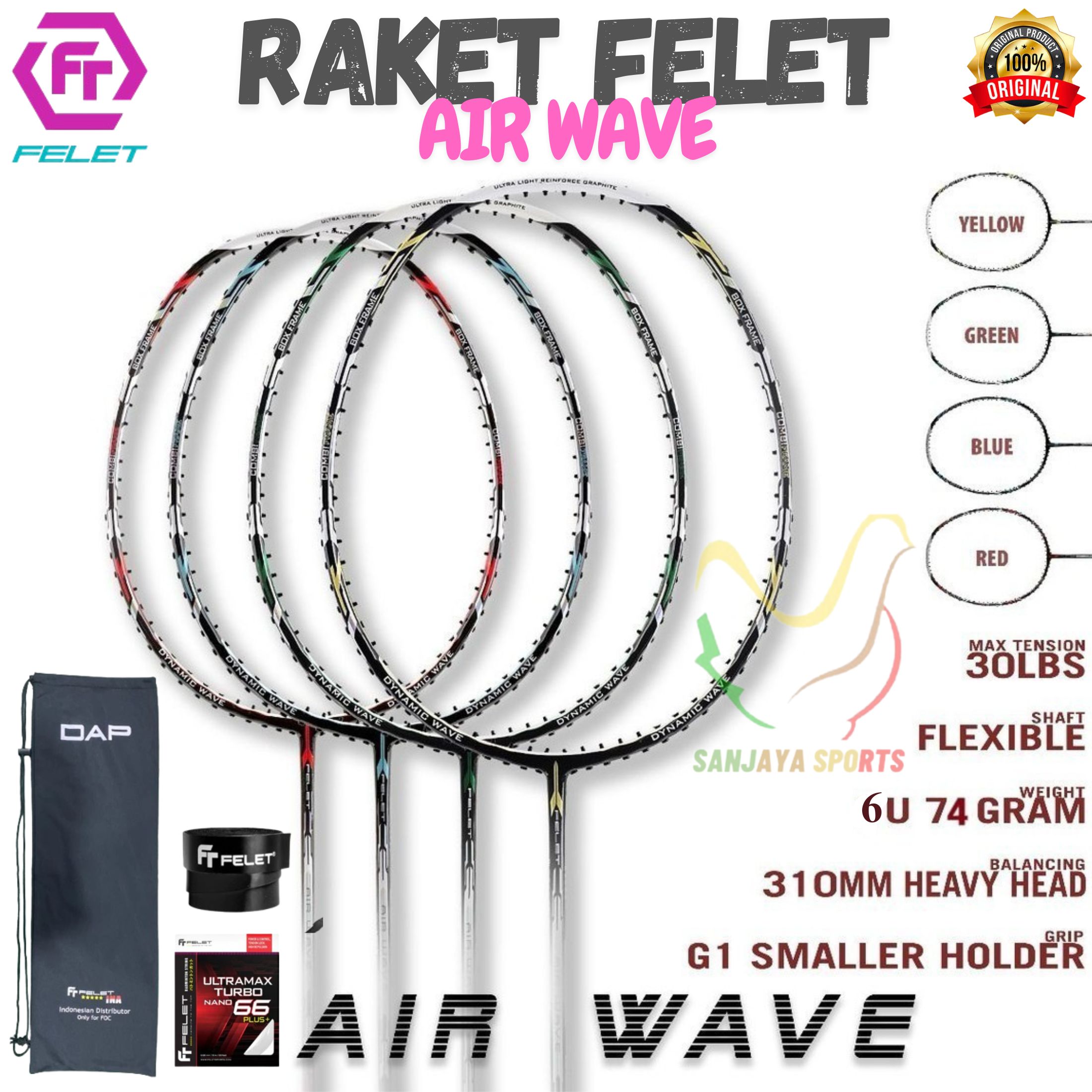 FELET RAKET BADMINTON FELET WOVEN TJ 1000 3U & 4U=HABIS ORIGINAL. BONUS: RAKET COVER PVC, OVER GRIP 750D, SENAR FELET ULTRAMAX TURBONANO 66 WHITE Harga :