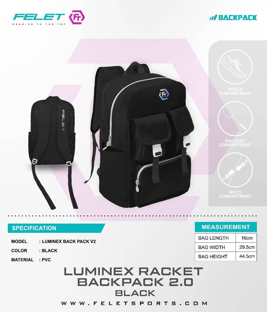 Tas Felet LUMINEX 2.0 Backpack Tas Ransel Tas Raket Badminton/Tennis Original FELET BLACK